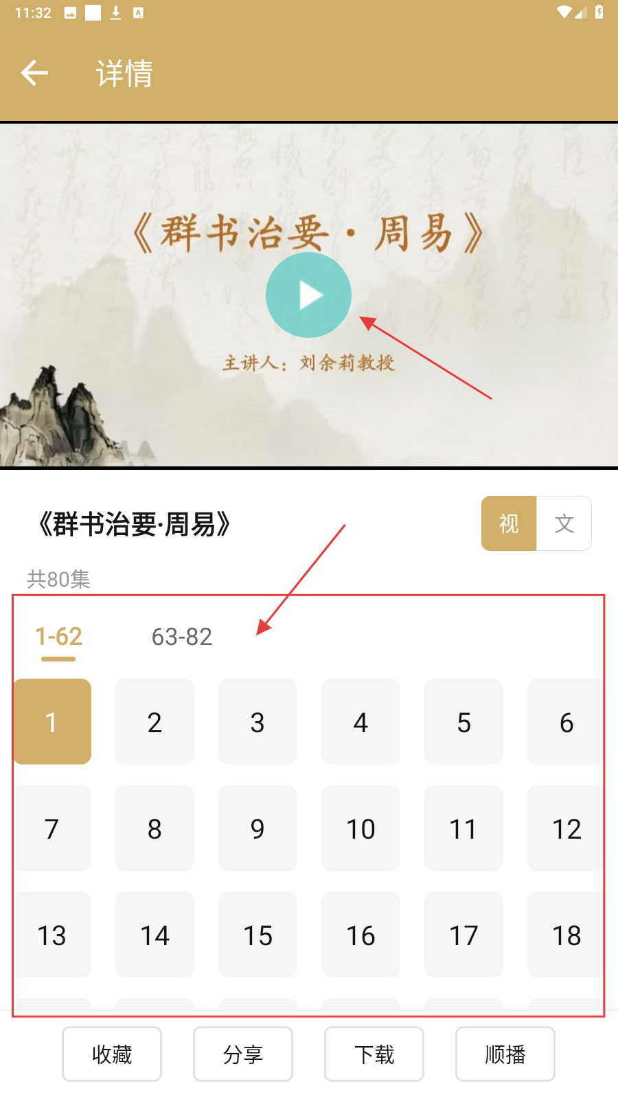 3、进入《群书治要·周易》详情,点播放按钮开始学习,也可选集数栏切换内容。