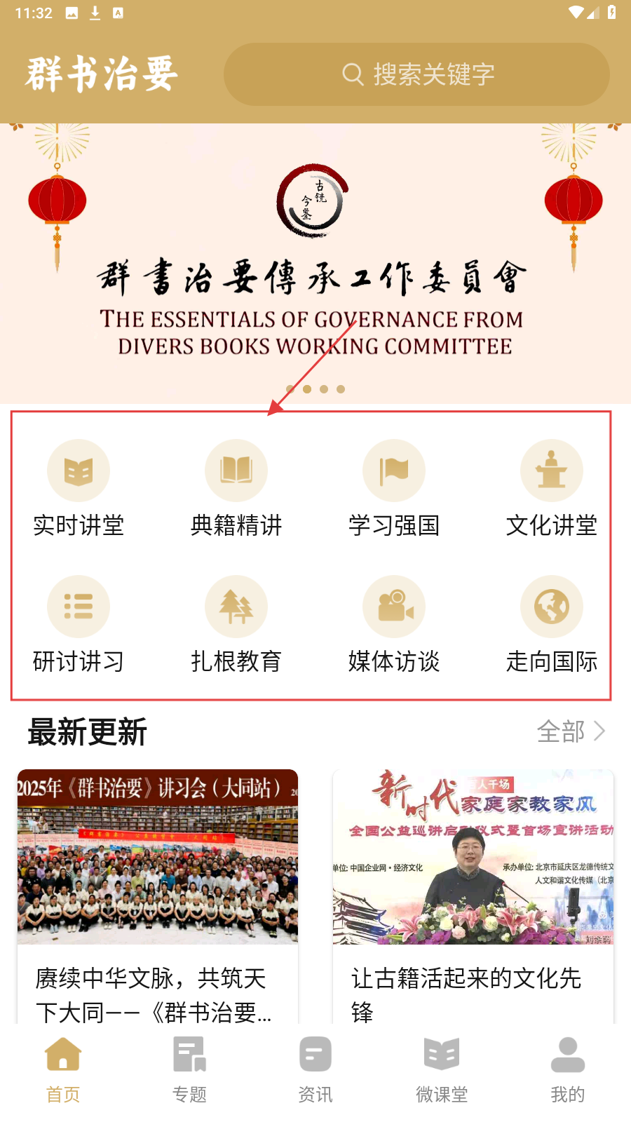 1、进入首页,找到【典籍精讲】入口,点击进入可探索经典典籍学习板块。