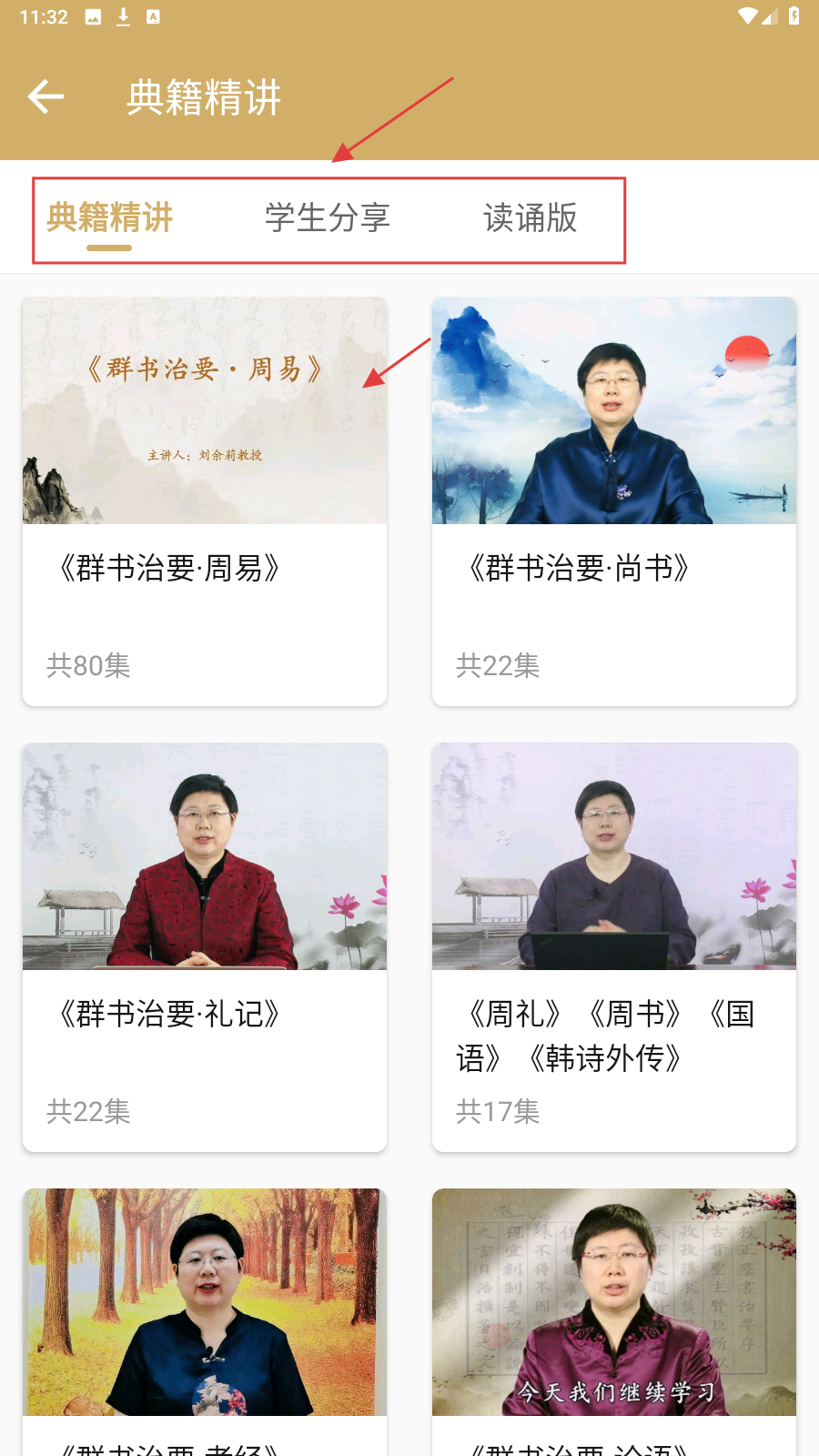 2、在【典籍精讲】页,选【典籍精讲】标签,找到《群书治要·周易》,点击进入详情。