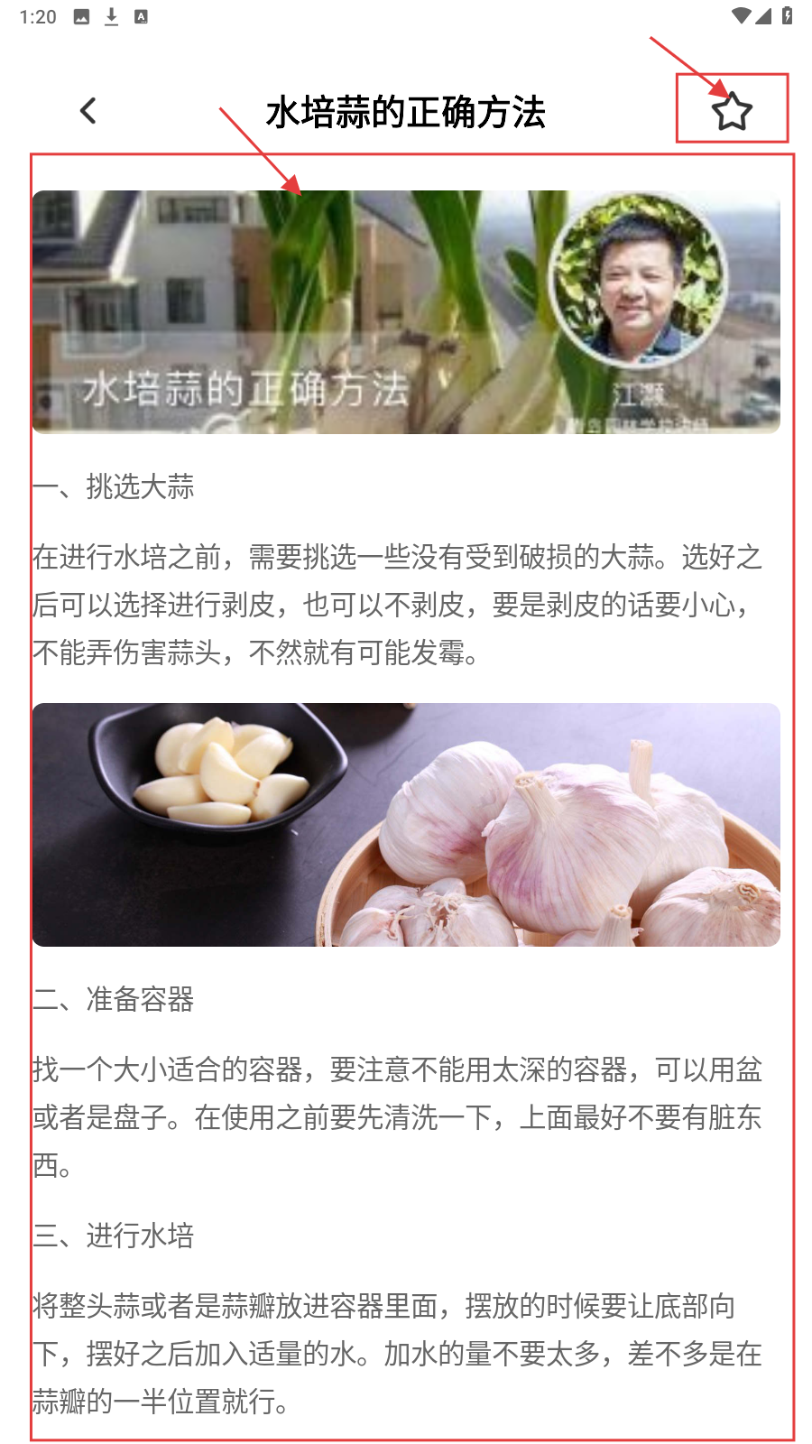 3、阅读文章时,点右上角收藏图标,可将《水培蒜的正确方法》存入【我的收藏】。