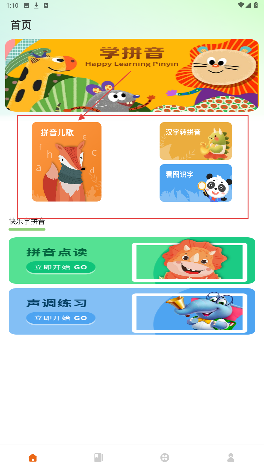 1、进入首页,选【拼音儿歌】,可开启拼音启蒙学习,还有其他拼音学习功能可选。