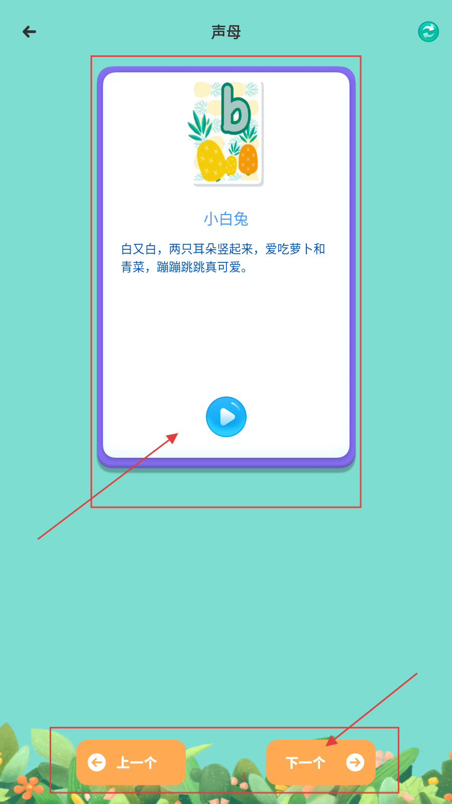4、学习声母“p”时,看图文、听发音,借助【上一个】【下一个】学更多声母。