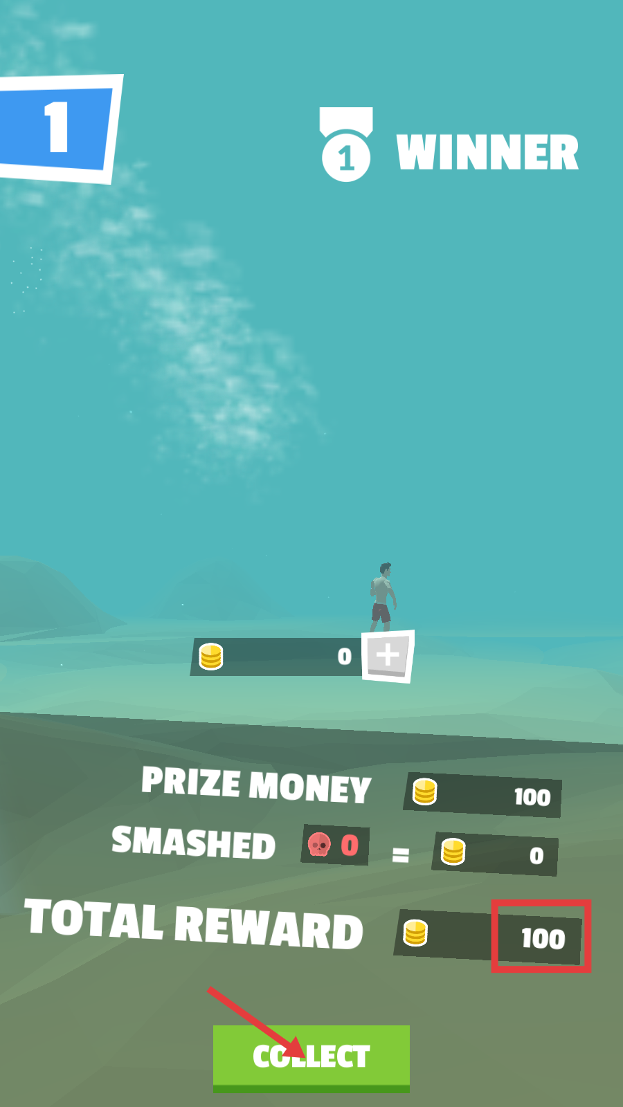 4、比赛胜利后出现【WINNER】界面,点击绿色【COLLECT】按钮,即可领取【TOTAL-REWARD】100金币奖励。