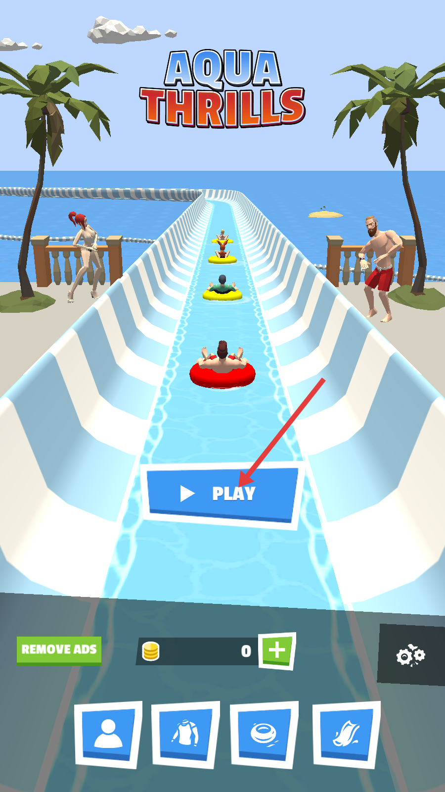 1、进入【AQUA-THRILLS】游戏界面,点击蓝色【PLAY】按钮,即可开启水上滑道竞速挑战。