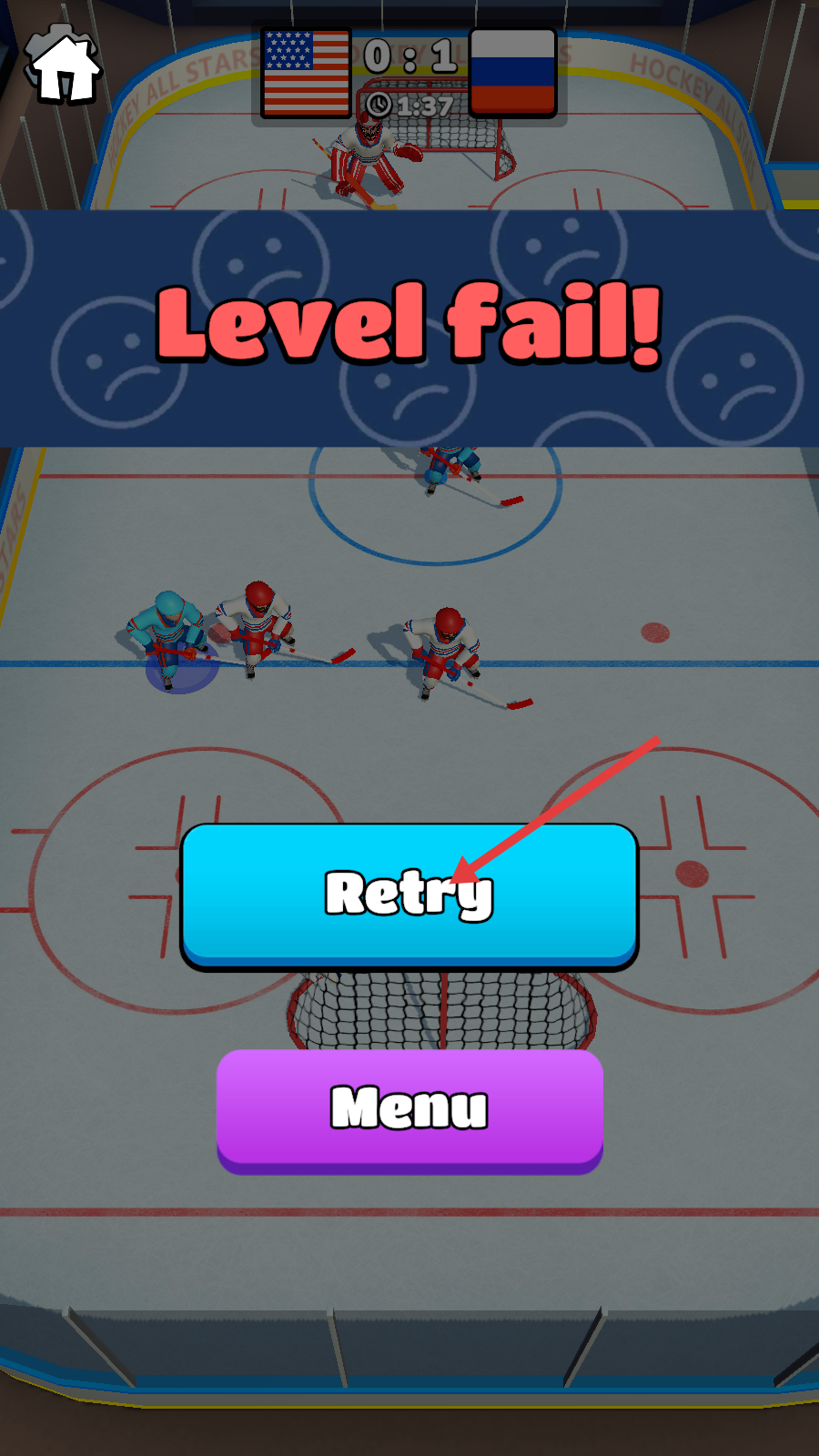 4、若显示【Level-fail!】,可点蓝色【Retry】重新挑战,或选紫色【Menu】返回赛事选择界面。
