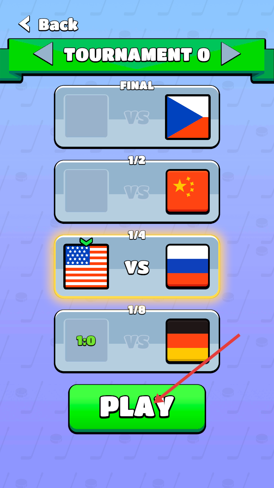 1、查看【TOURNAMENT-0】赛事对阵信息,选好对应轮次后点击绿色【PLAY】按钮,即可开启冰球对战。