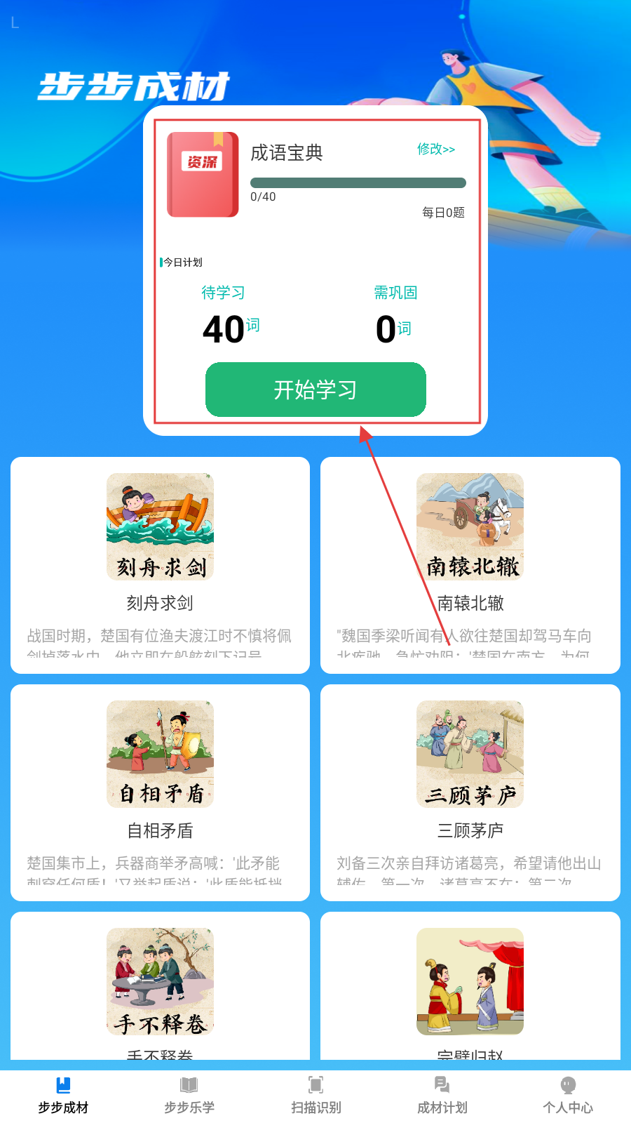 1、进入【步步成材】,点【成语宝典-开始学习】,开启成语学习。