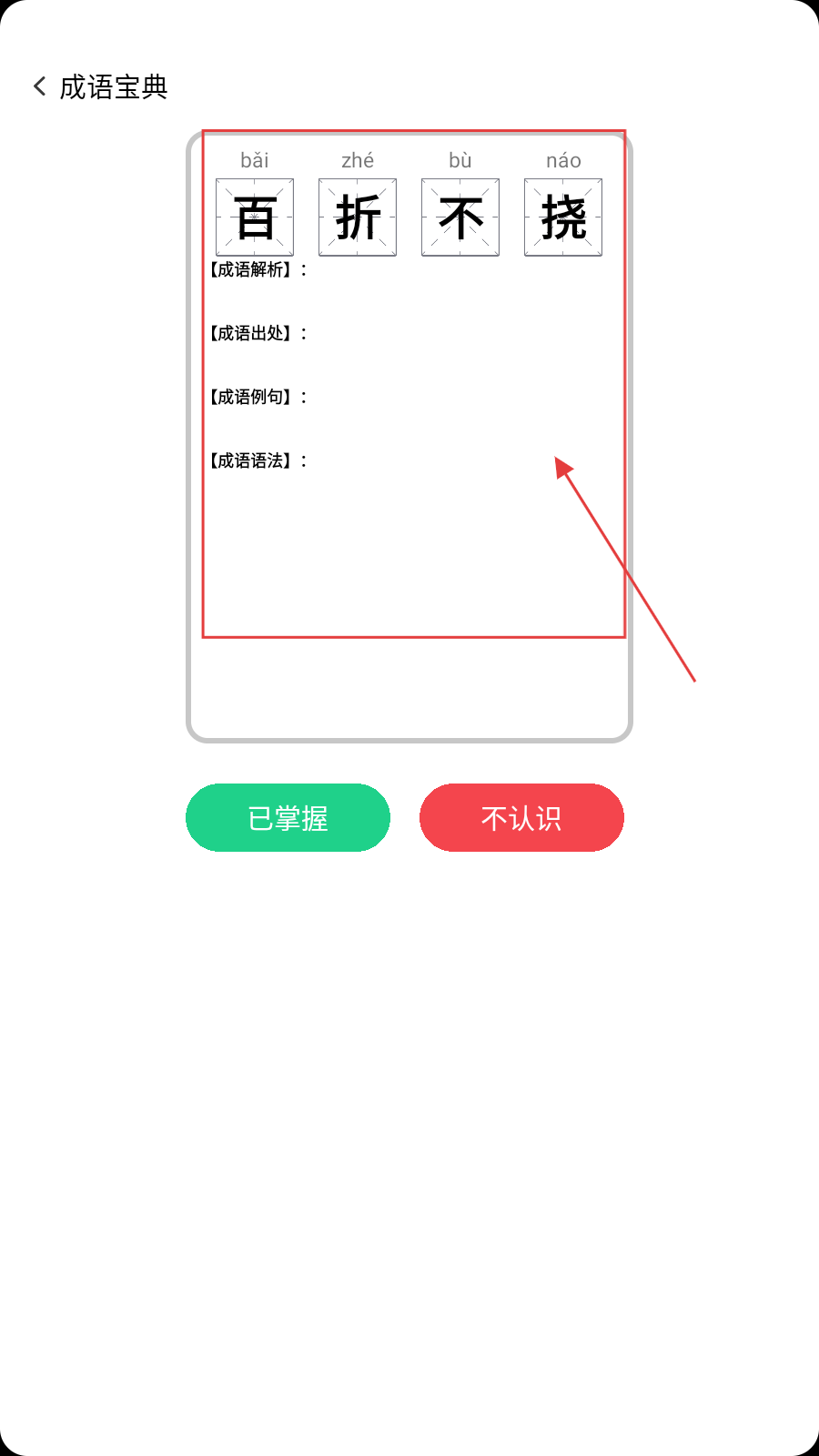 4、学习新成语【百折不挠】,完善【成语解析】等内容后标记掌握。