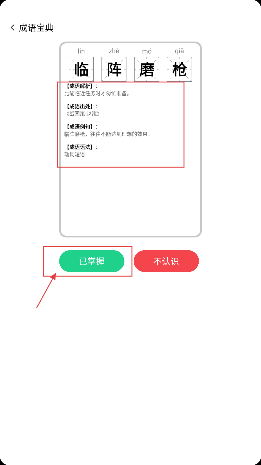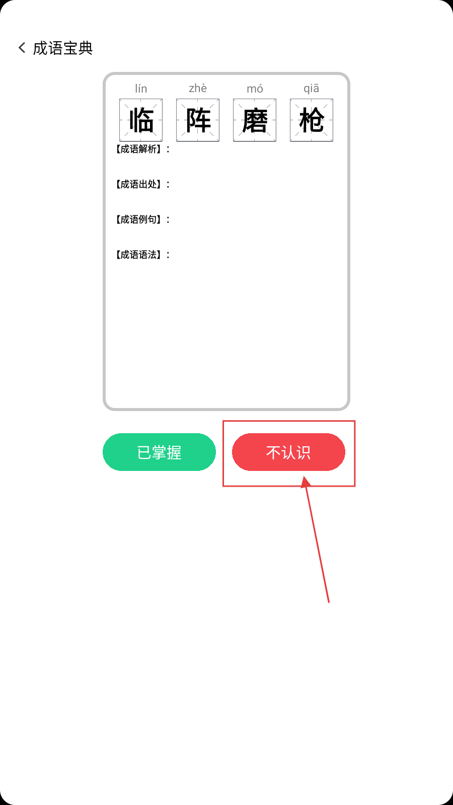 2、遇成语【临阵磨枪】,若不认识,点【不认识】看解析。