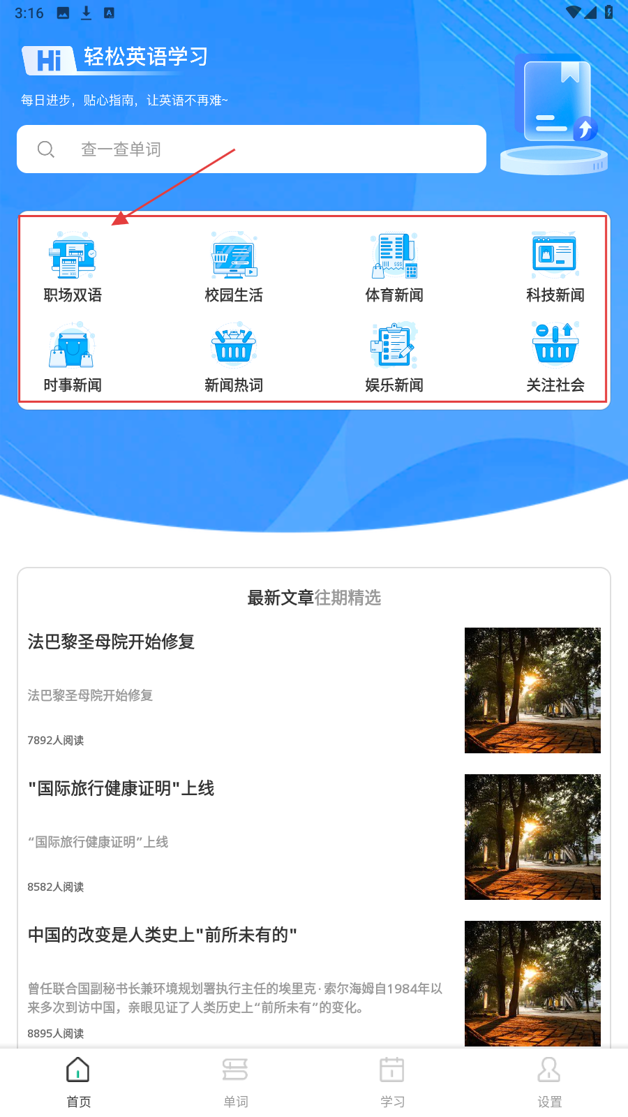 1、进入应用首页,选【职场双语】等分类,开启英语阅读。