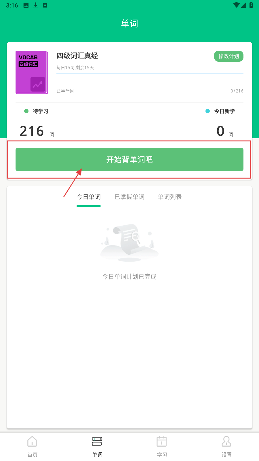 4、切换【单词】页,点【开始背单词吧】,按计划学习【四级词汇真经】单词。