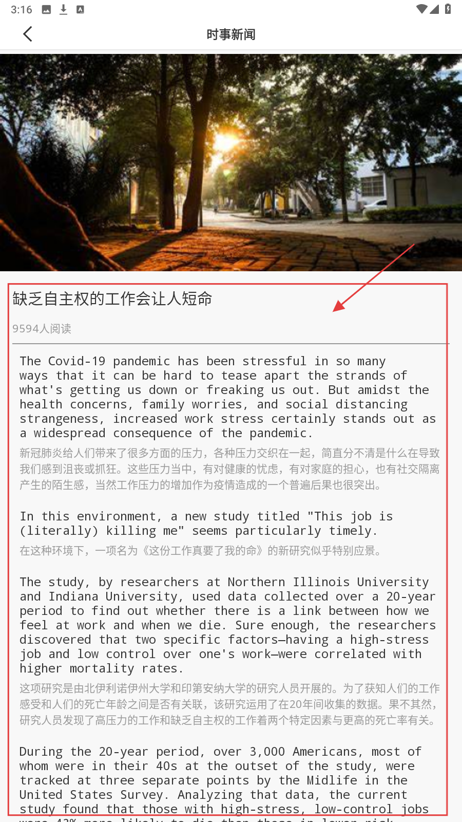 2、在【阅读专项】页,切换分类,选感兴趣文章,如《缺乏自主权的工作会让人短命》。