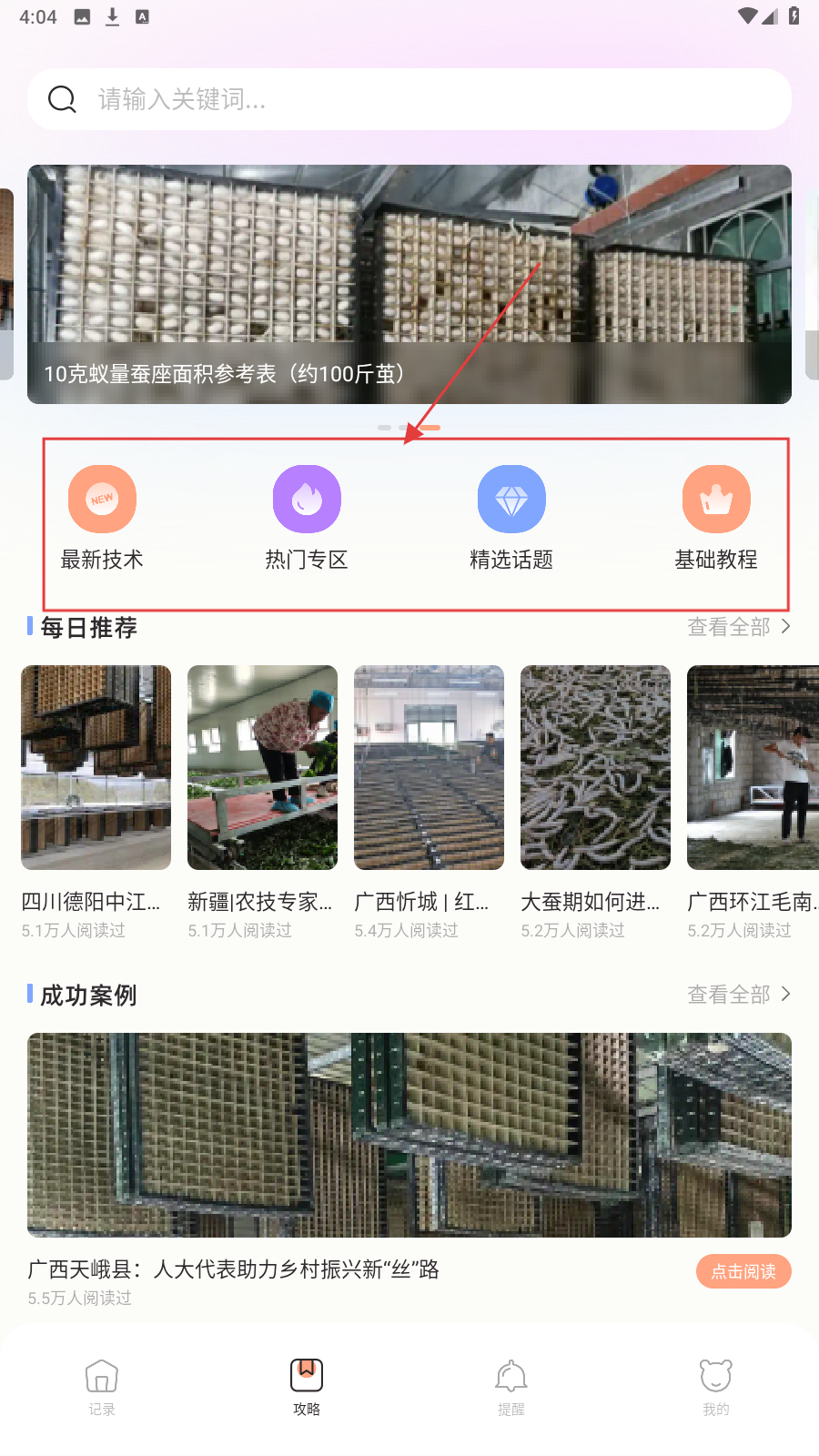 4、切【攻略】页,选【最新技术】等专区,浏览蚕养殖知识。