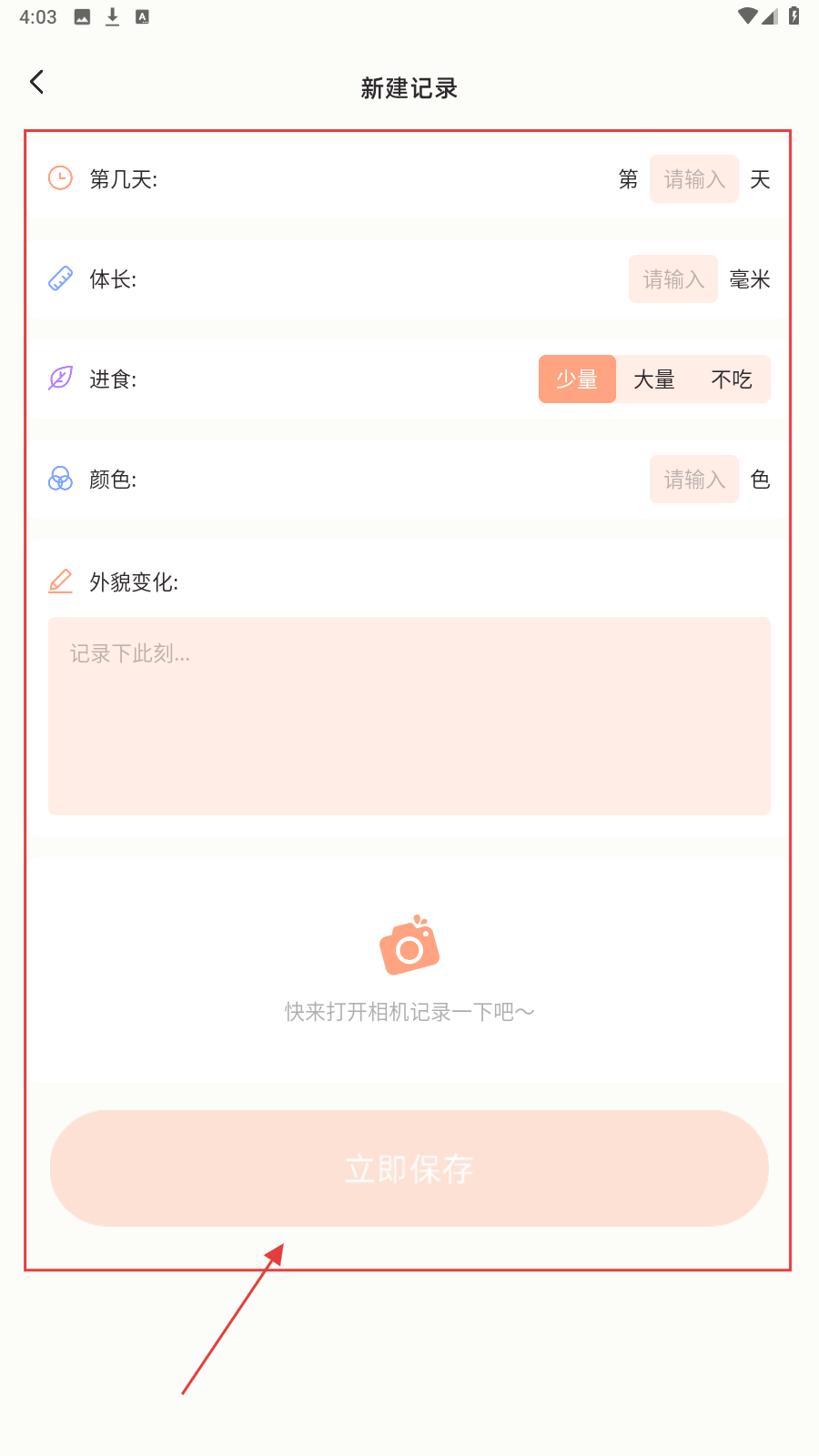 2、填【第几天】【体长】等信息,选进食量,点【立即保存】。