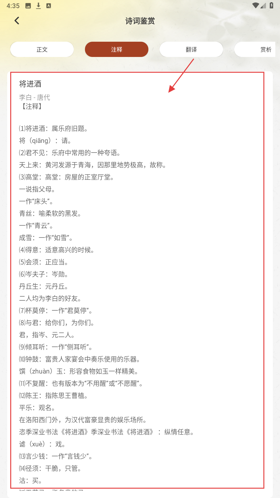 4、切换【注释】标签,了解“将进酒-属乐府旧题”等字词解析。