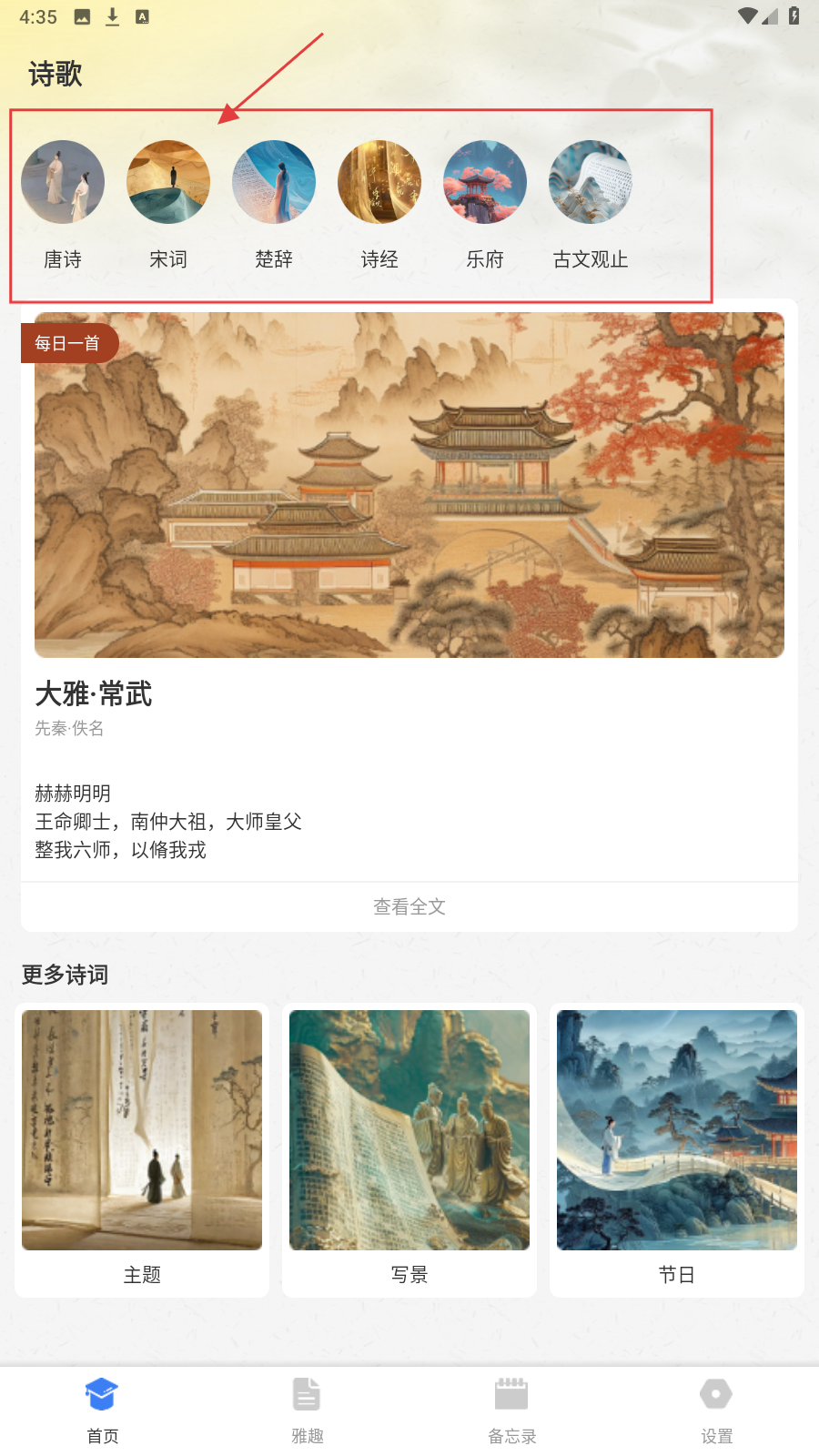 1、进入诗歌页,选【唐诗】【宋词】等分类,开启诗词学习。