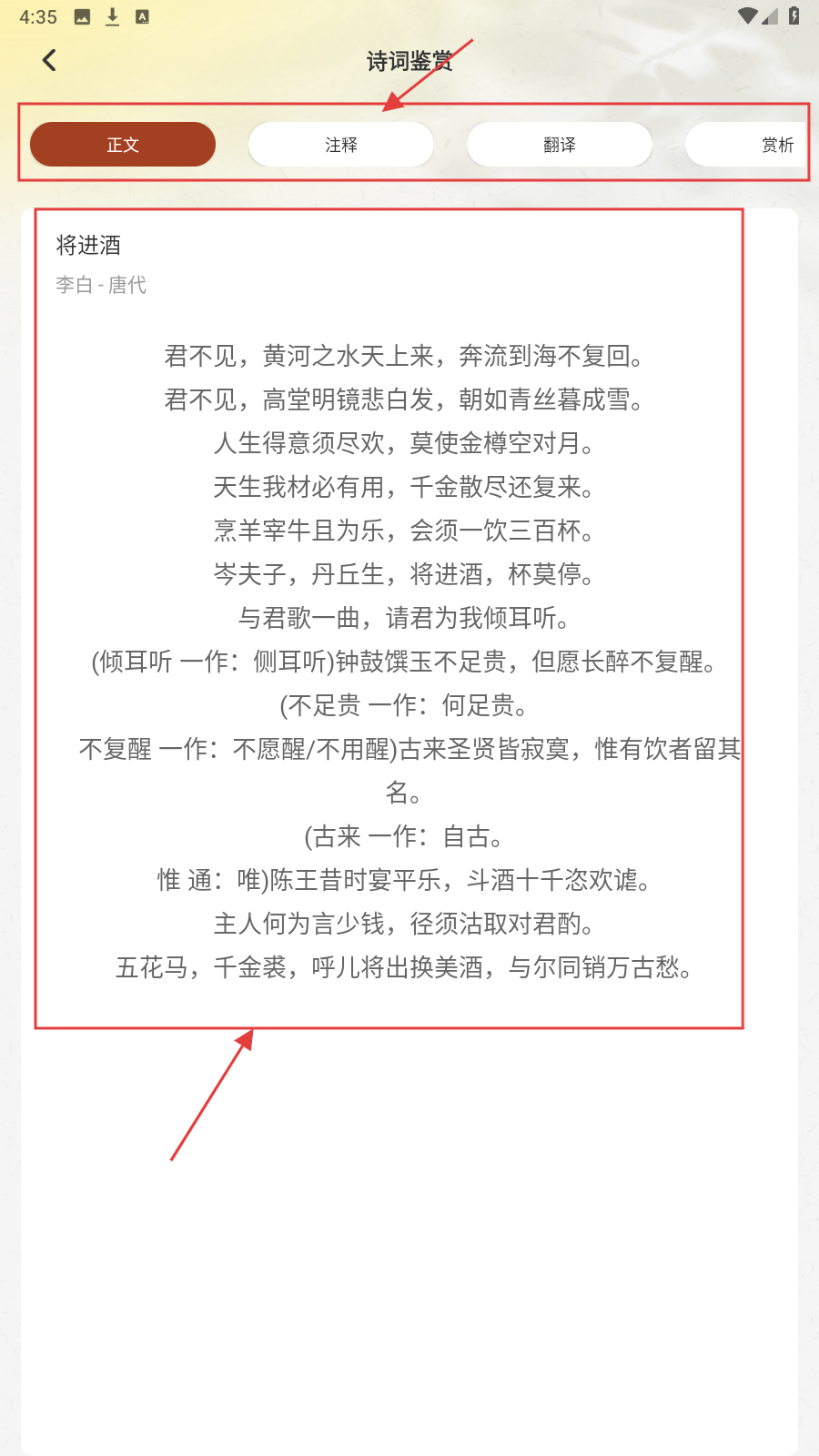 3、进入诗词鉴赏页,查看【正文】,阅读《将进酒》完整内容。