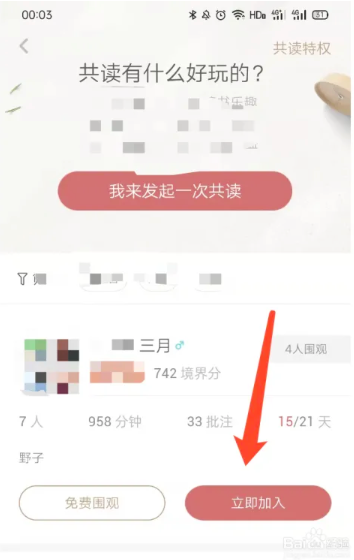 2、进入共读页面,我们可以选择我们想要加入的小组,一起阅读某一本书,可以看到其他的人的阅读进度和相关笔记。同时还可以选择围观,也就是说自己阅读该本书的动态不会被别人看到,但是自己可以看别人对这本书的动态。