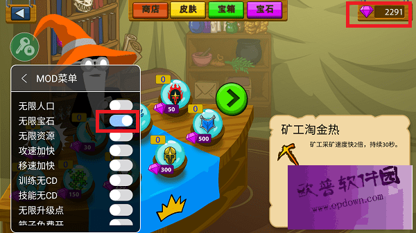 3、商城为例子,在里边点开无限钻石,右上角的钻石就会无限增加,可以自由购买商品~其他功能战斗中也可以使用!