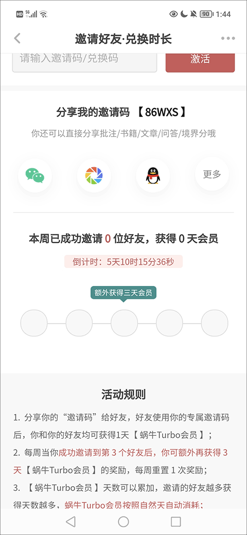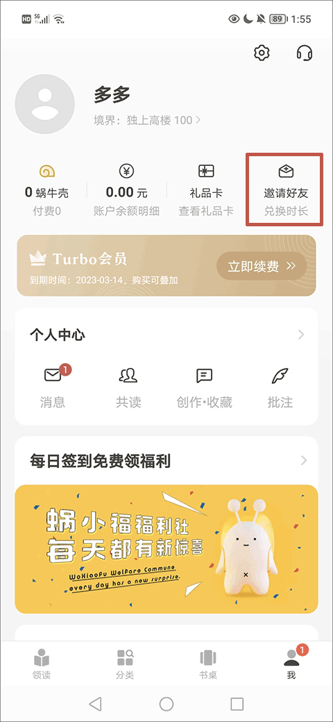 而要是不想花钱的话,其实也有方法可以获得阅读时长那就是邀请好友。通过个人中心邀请好友的功能分享邀请码,每邀请到1个用户就可以获得1天的会员,也就能够解锁的相应的阅读时长哦!