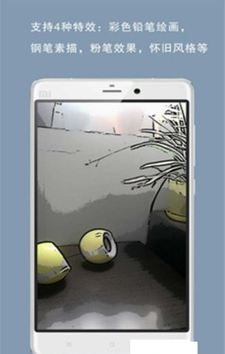 1、素描特效相机软件支持4种特效:彩色铅笔绘画,钢笔素描,粉笔效果,怀旧风格等。