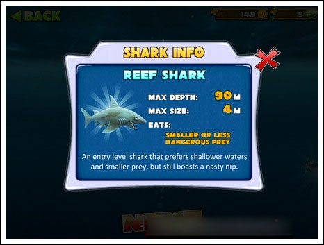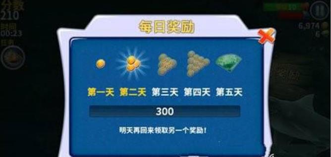 1、首先玩家刷钻石时使用的鲨鱼最好是初始的鲨鱼礁鲨,因为刷金币和钻石的地点正是礁鲨出生地下方的每日签到处。每日签到的前四天领取的是金币,200-500不等,而第五天的奖励是获得5个钻石。