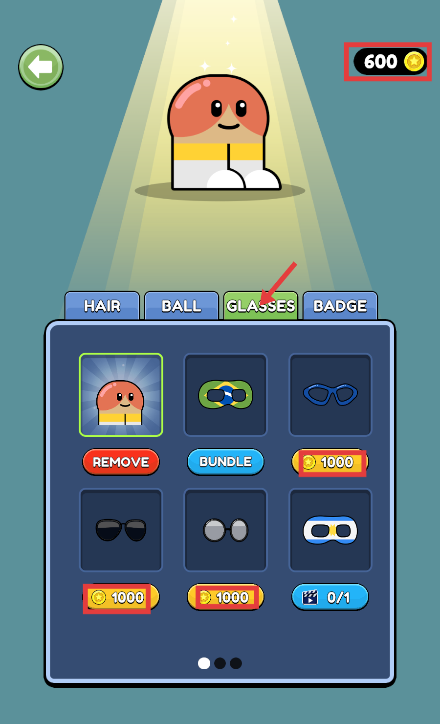 1、进入角色装扮页,点【GLASSES】选项卡,可用【1000】金币购眼镜,当前【600】金币需后续积累获取。
