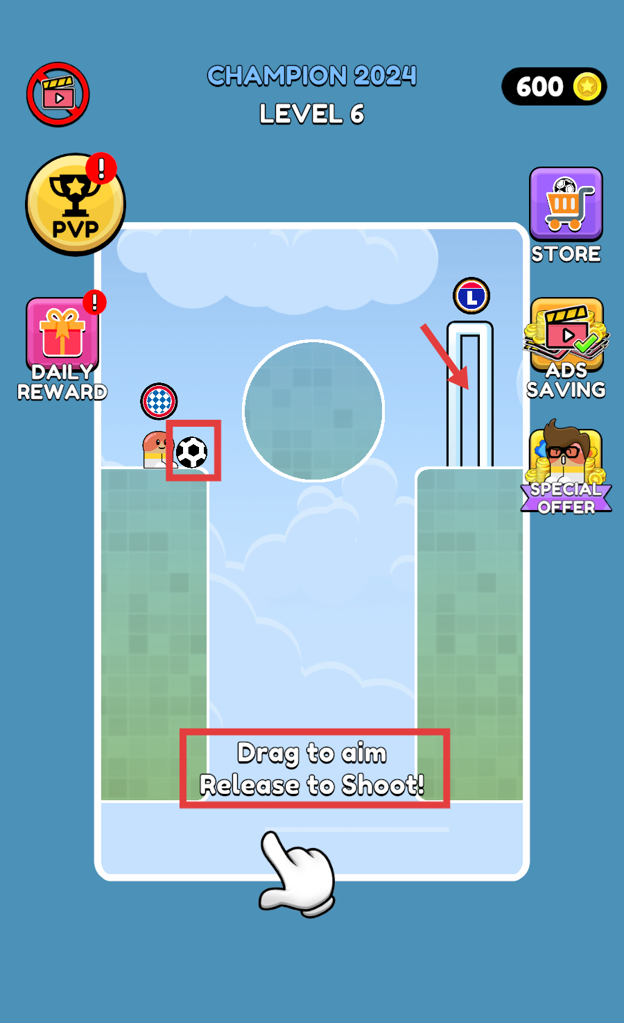 2、LEVEL-6关卡按提示【Drag-to-aim】【Release-to-Shoot!】,拖动足球瞄准右侧目标,精准把控射击时机推进关卡。