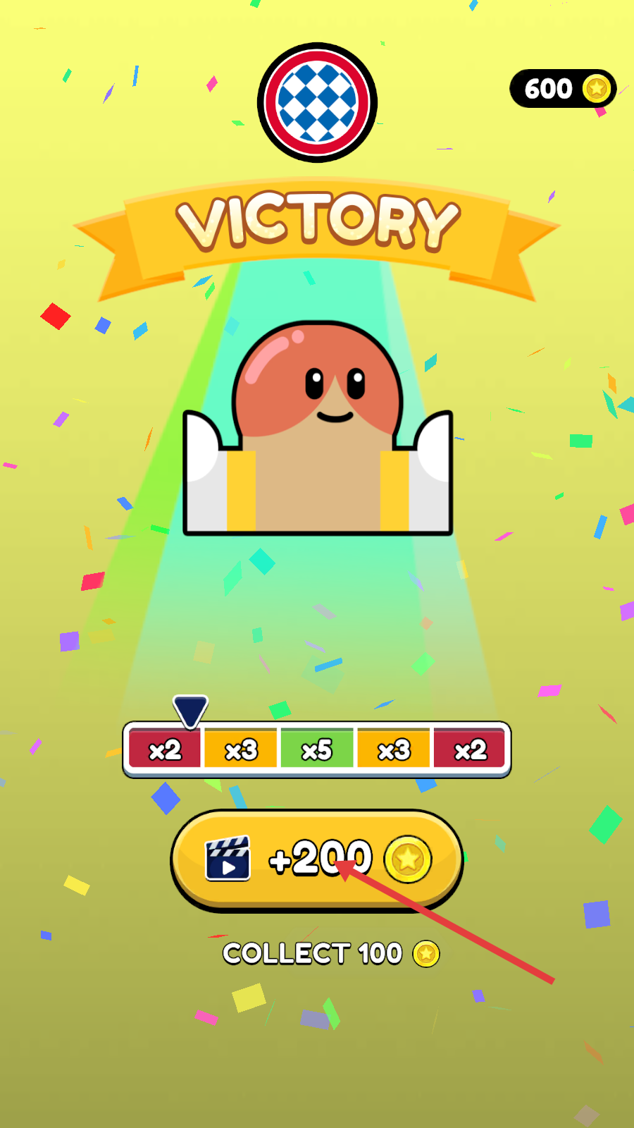 4、胜利后出现【VICTORY】界面,可点【 200】看广告加倍奖励,或直接选【COLLECT-100】领取基础金币。