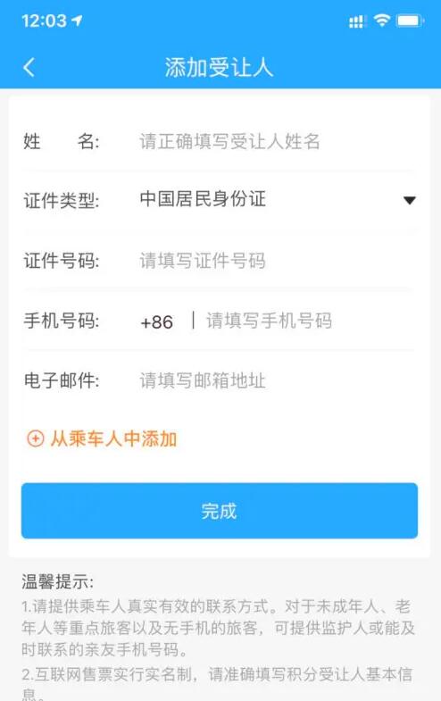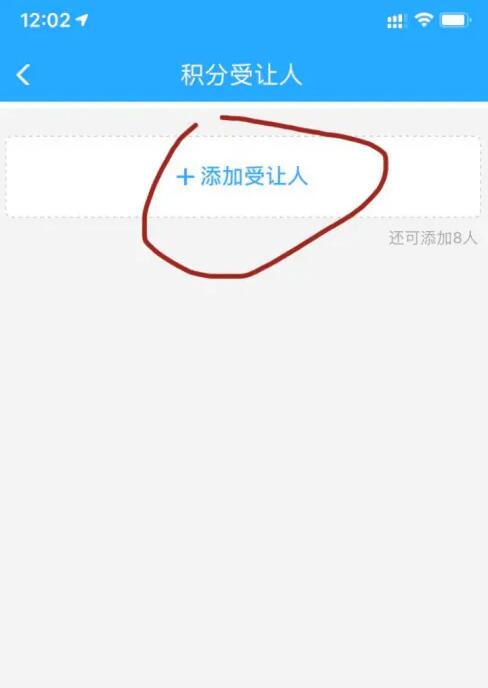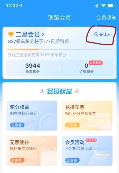 点击会员页面右上角的【受让人】,添加后才可以让受让人使用积分兑换车票。