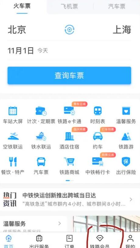 打开12306APP首页,点击底部菜单的【铁路会员】,用于查看自己的积分。
