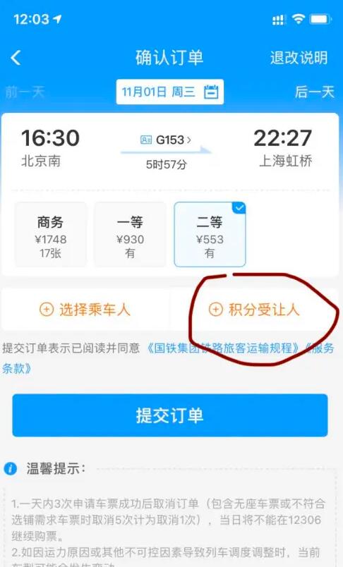 点进“兑”字车次进行购票,然后点击【积分受让人】,选择刚刚填写过的受让人。
