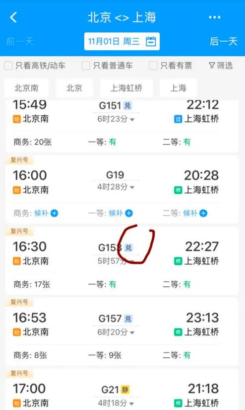 回到首页,挑选带有“兑”字样的车次。没有“兑”字样的车次是没有积分支付选项的,因此并不是任何车次的票都可以用积分兑换。