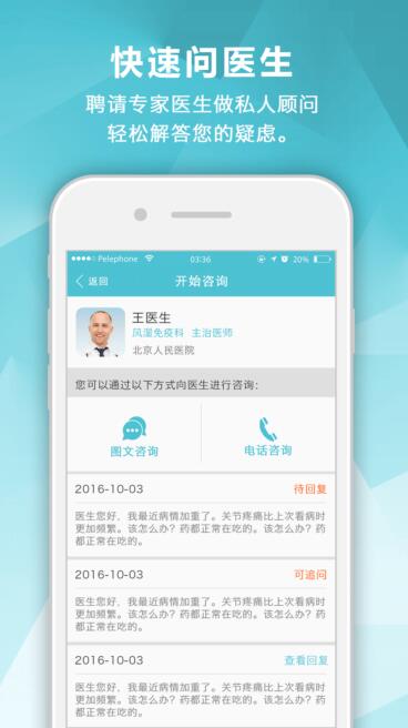 2、在线咨询,通过电话、图文信息直接咨询医生病情,支持个人的解答。