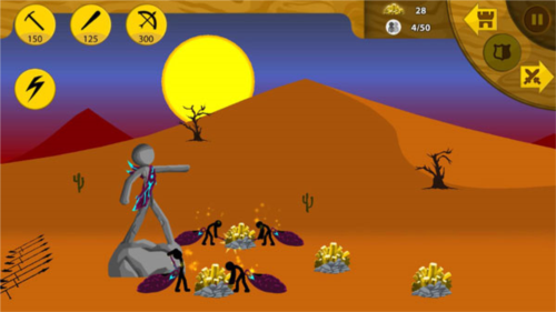 1、有足够的矿石,就能点击攻击类的火柴人,派遣它们去摧毁敌人的基地。