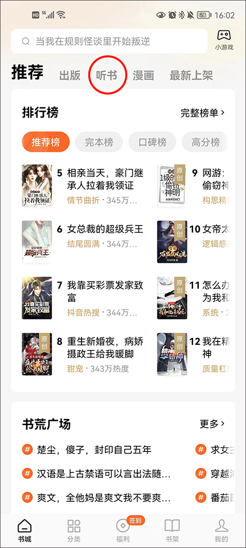 1、首先打开app进入到首页,在搜索栏下分排版中就有听书功能。