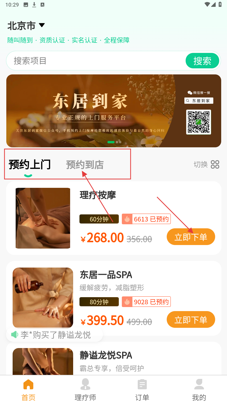 1、打开应用,在【首页】可以选择预约上门或者预约到店,如选择【预约上门】。挑选心仪的套餐点击【立即下单】。