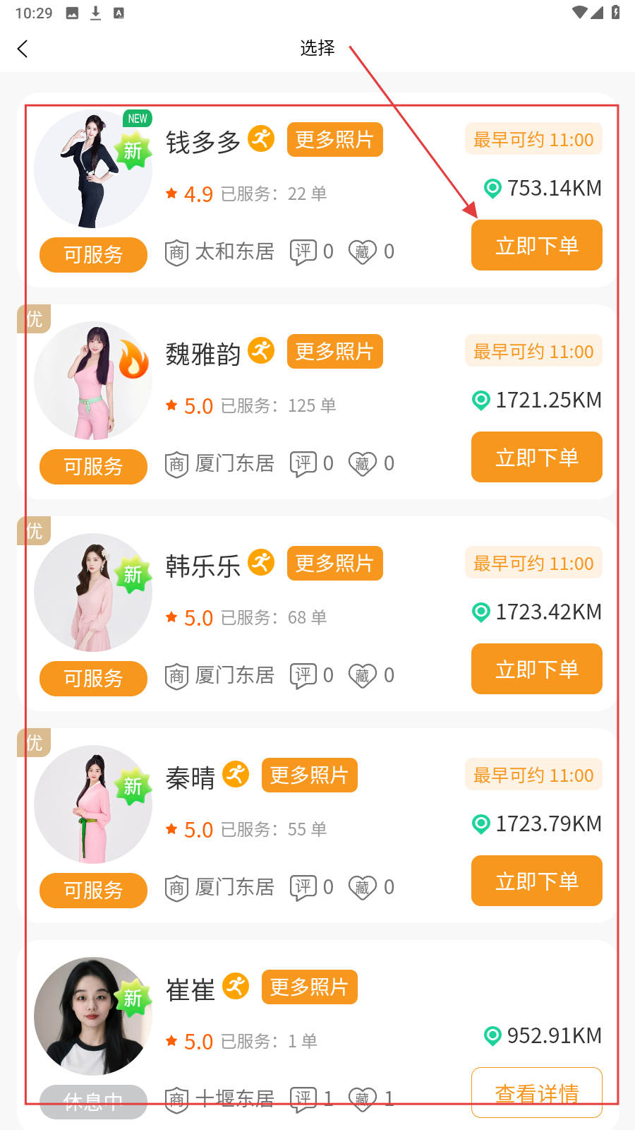 2、进入技师选择页,查看技师的详细信息,选择想预约的技师,点击【立即下单】。