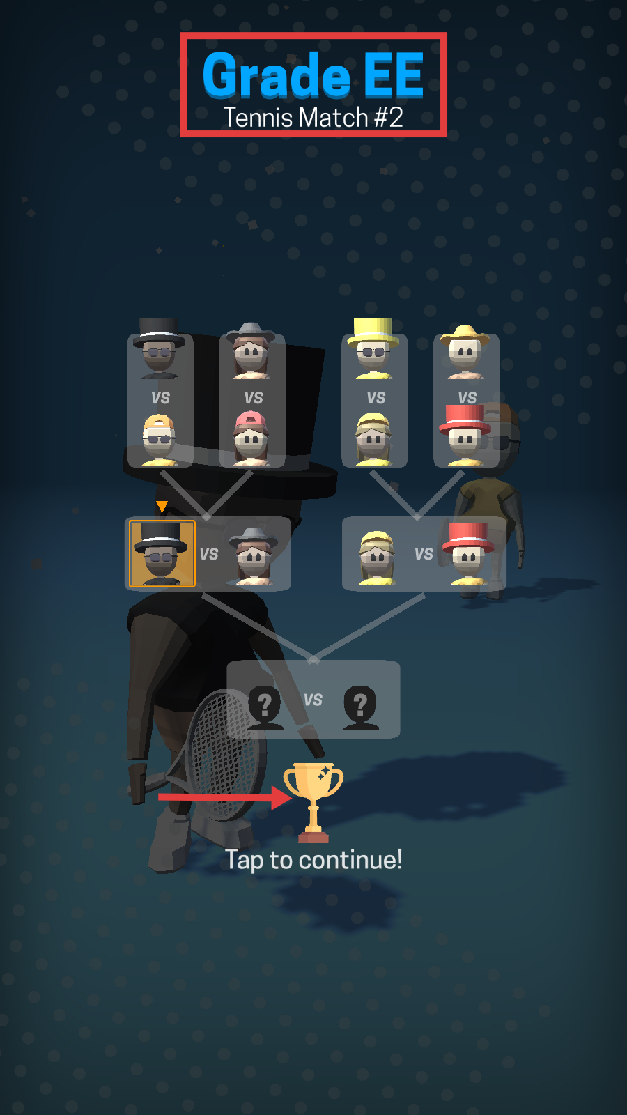 4、结束后进入【Grade-EE】的【Tennis-Match-#2】对战树,点击【Tap-to-continue!】,继续挑战下一轮对手冲击奖杯。