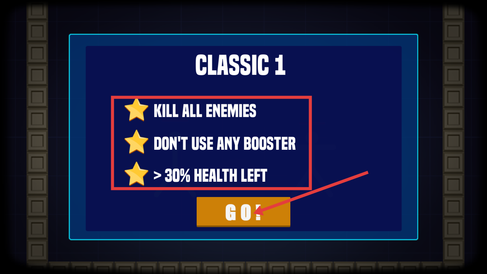 2、查看目标【KILL-ALL-ENEMIES】【DON'T-USE-ANY-BOOSTER】【>30%-HEALTH-LEFT】,点击【GO!】挑战。