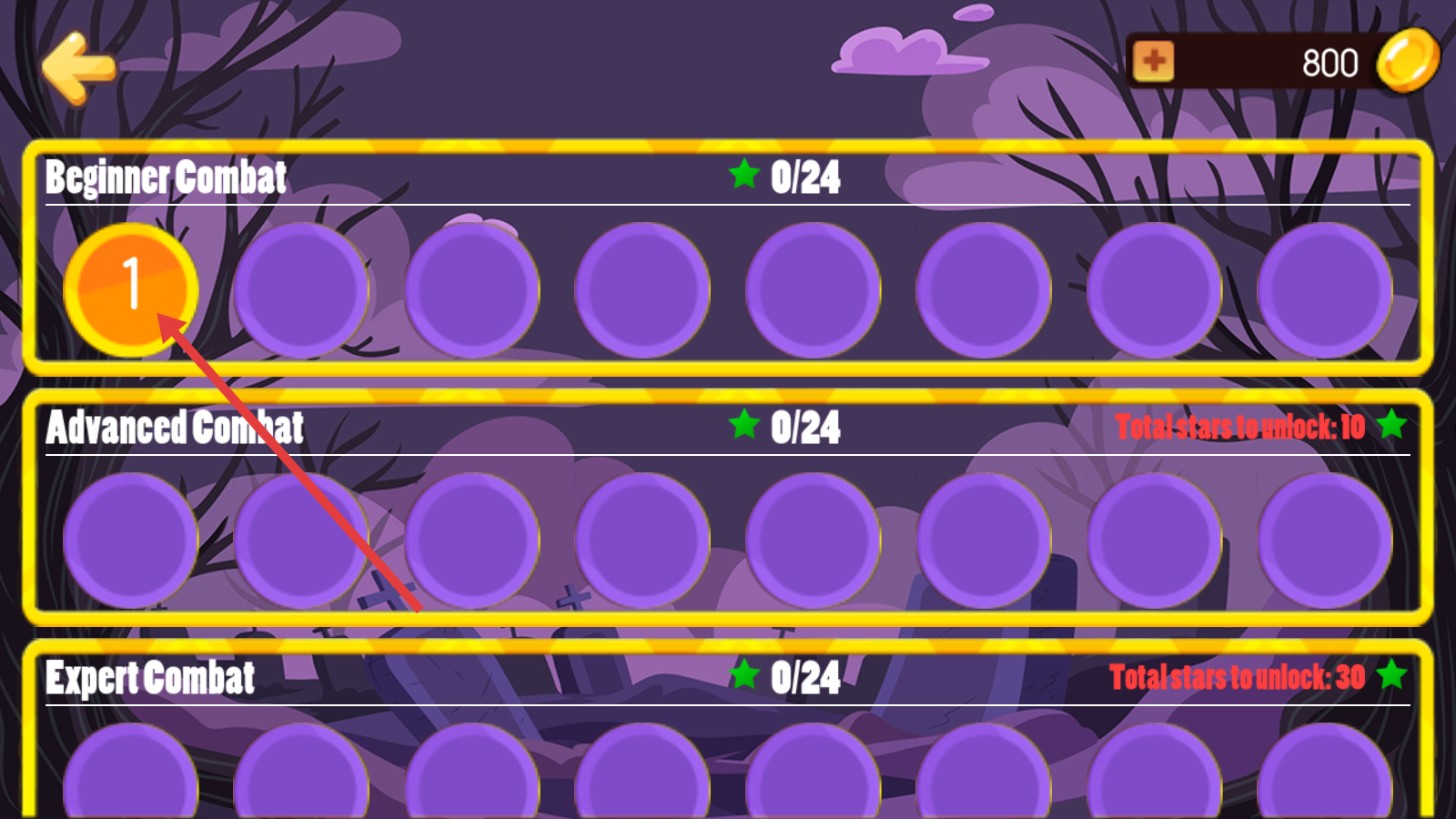1、进入关卡列表,选择【BeginnerCombat】下的【1】号关卡,开启新手战斗试炼。