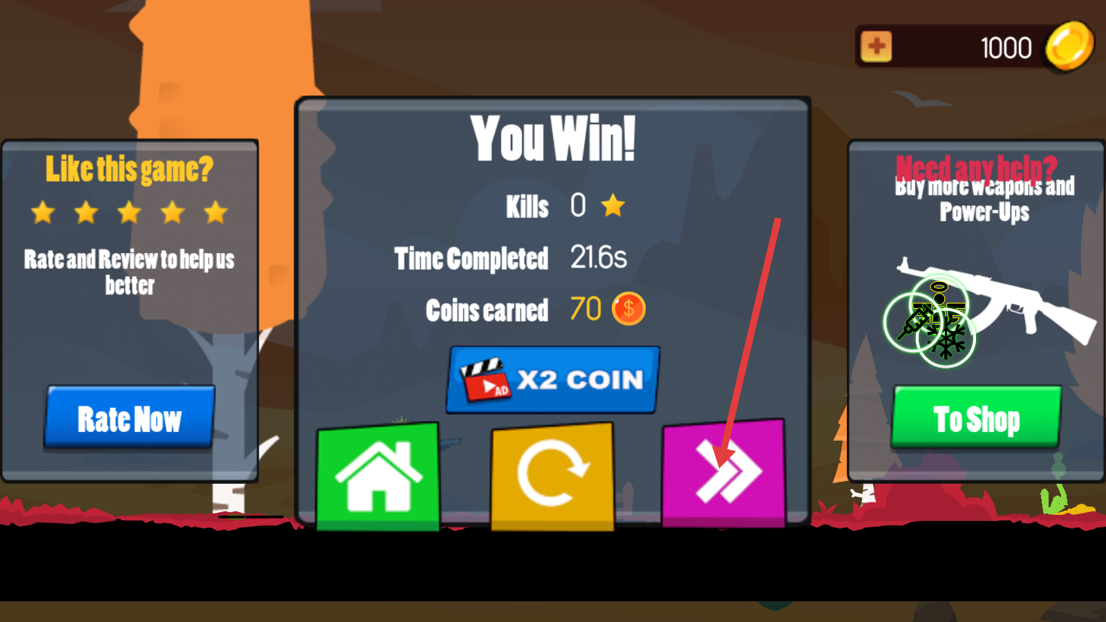 4、胜利后点击紫色【继续箭头】,领取【70-金币】,推进下一关,积累资源强化能力。