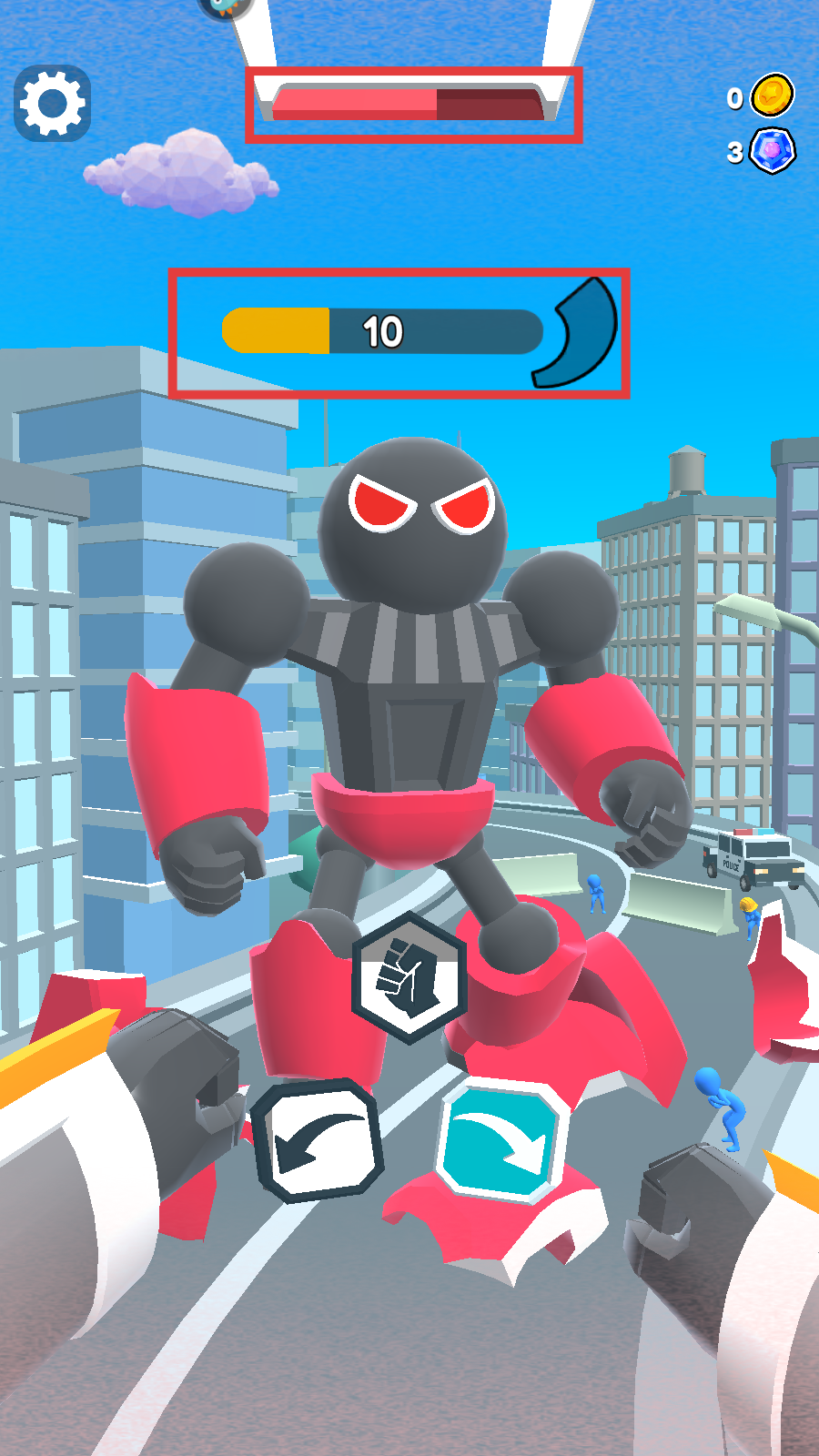 2、对战红色机甲时,按提示【拖动屏幕瞄准】,配合箭头与拳头按键进攻。