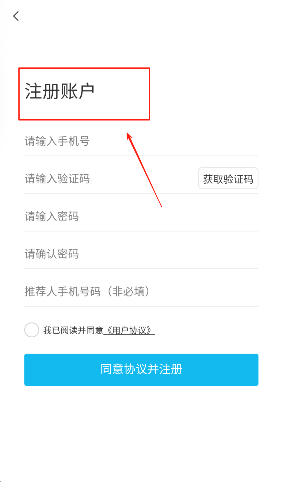 1、注册账户时记得先填手机号再点获取验证码呢,密码要输入两遍保持一致,推荐人号码可不填,最后勾选协议就能点蓝色注册按钮啦。