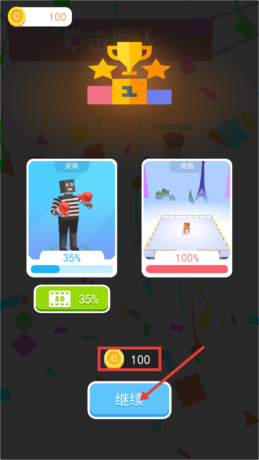 4、胜利后获取【100-金币】,点击【继续】按钮,推进后续关卡或解锁内容。