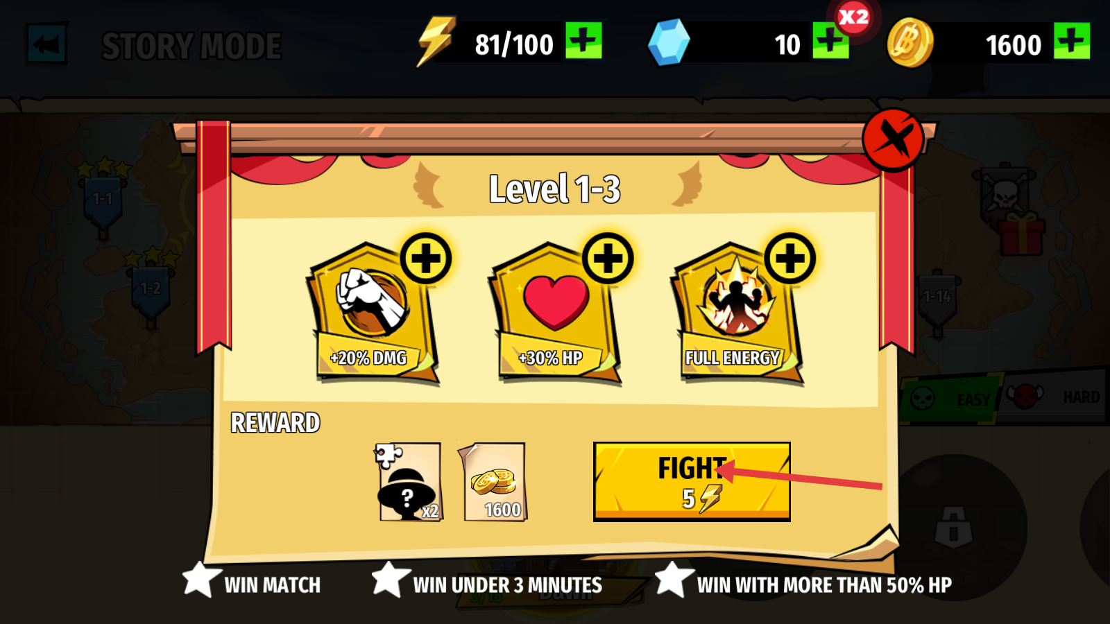 1、挑战【Level-1-3】前,激活【 20%DMG】【 30%HP】【FULL-ENERGY】加成,点击【FIGHT】消耗5体力开战。