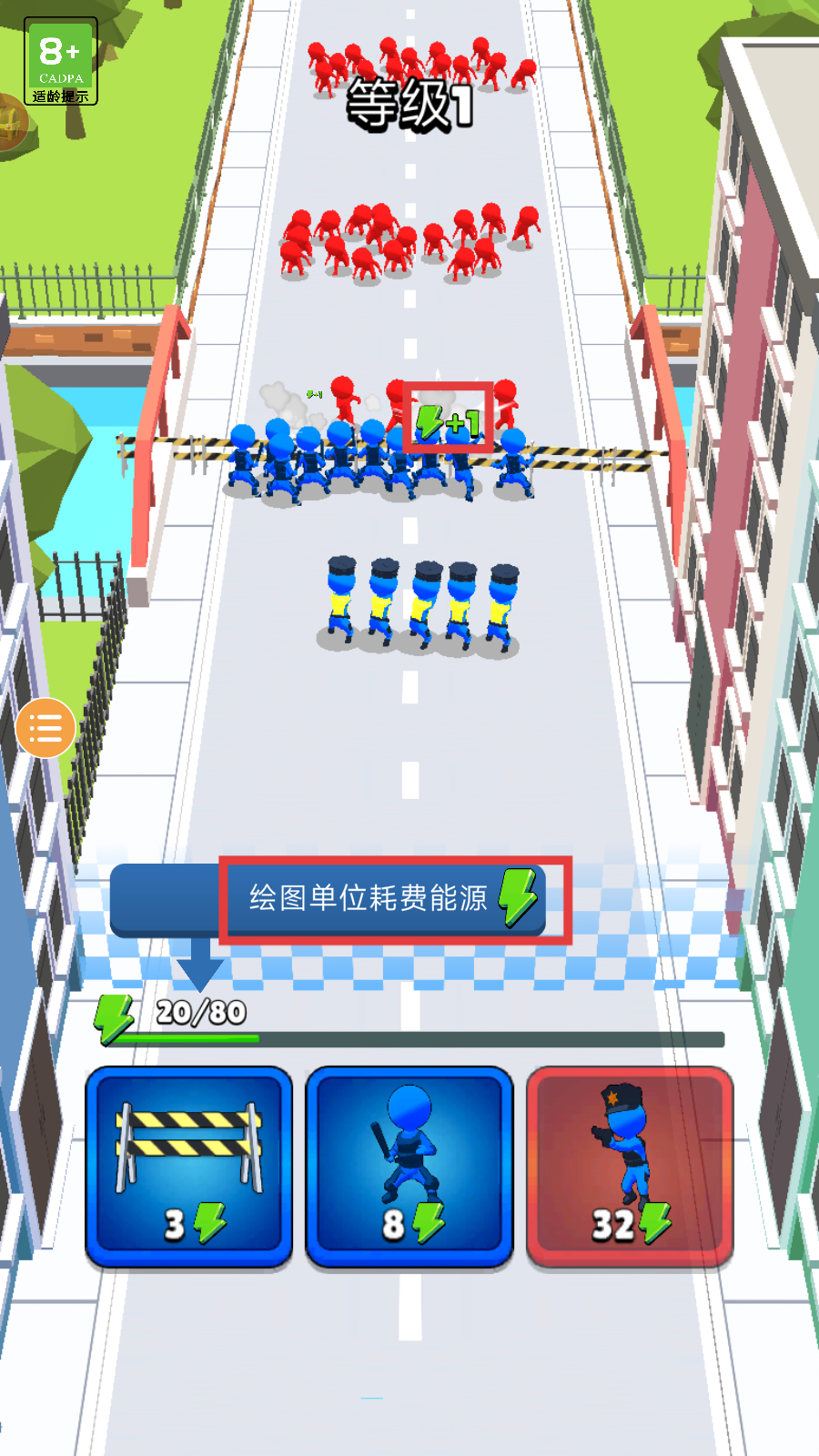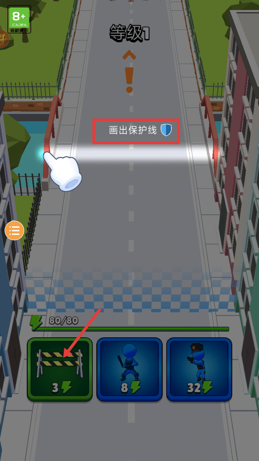 2、等级1按提示【画出保护线】,选择消耗3能量的路障道具布置,构建初始防御阵线抵御敌人。