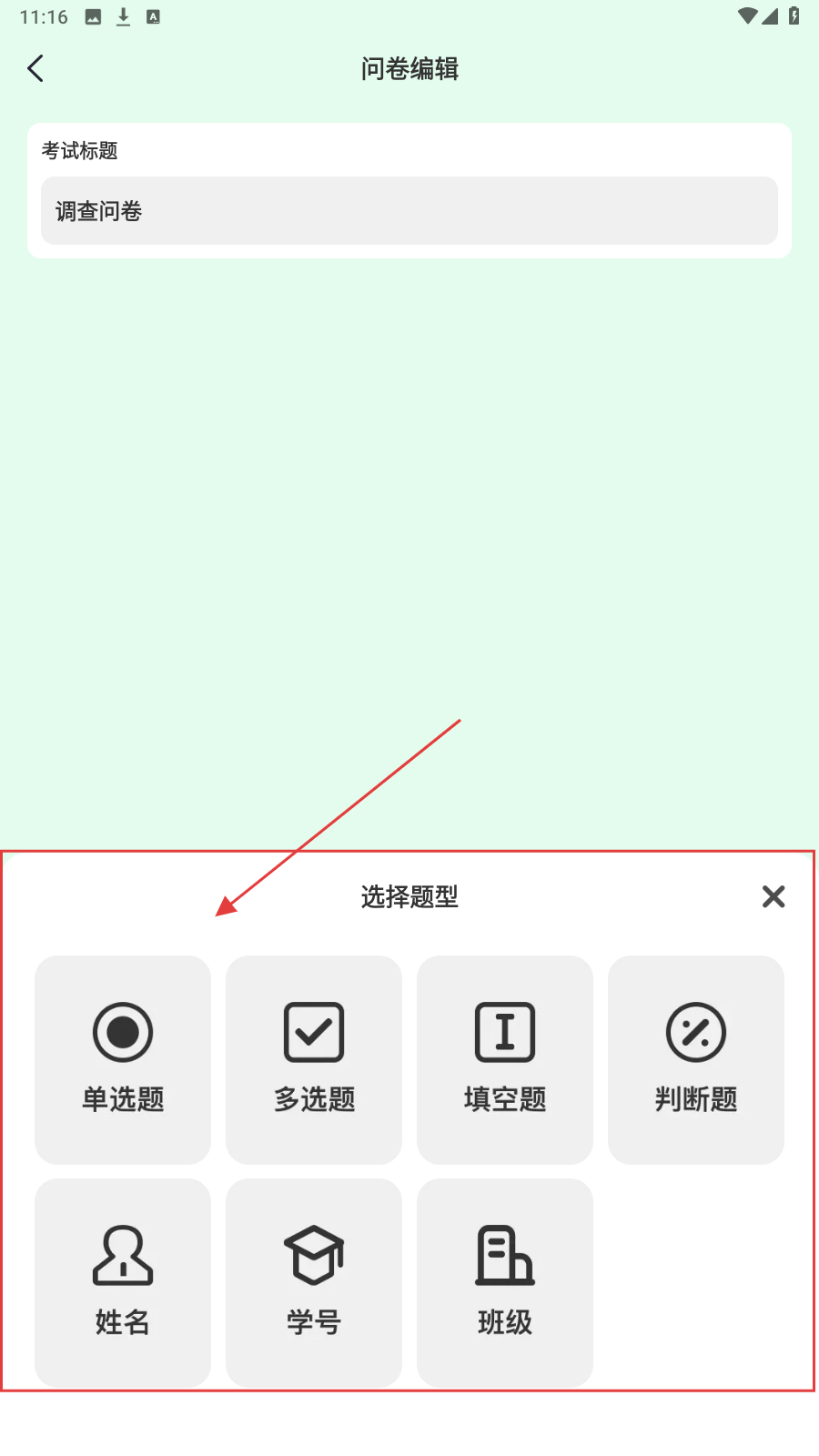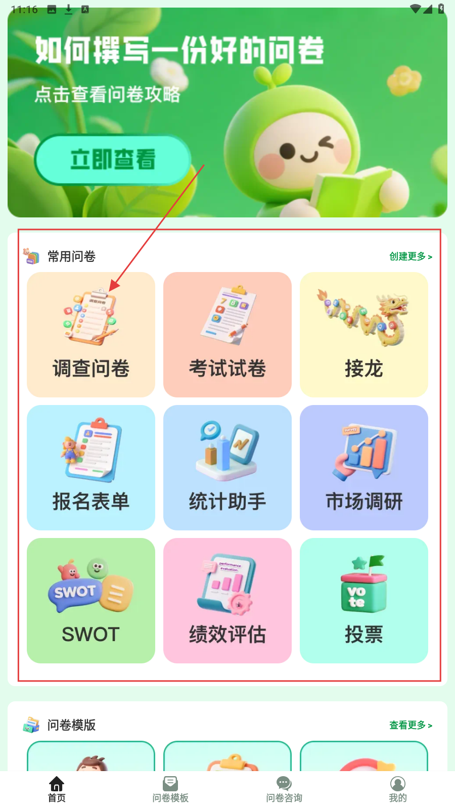 1、打开应用,选择要创建的类型,如点击【调查问卷】。