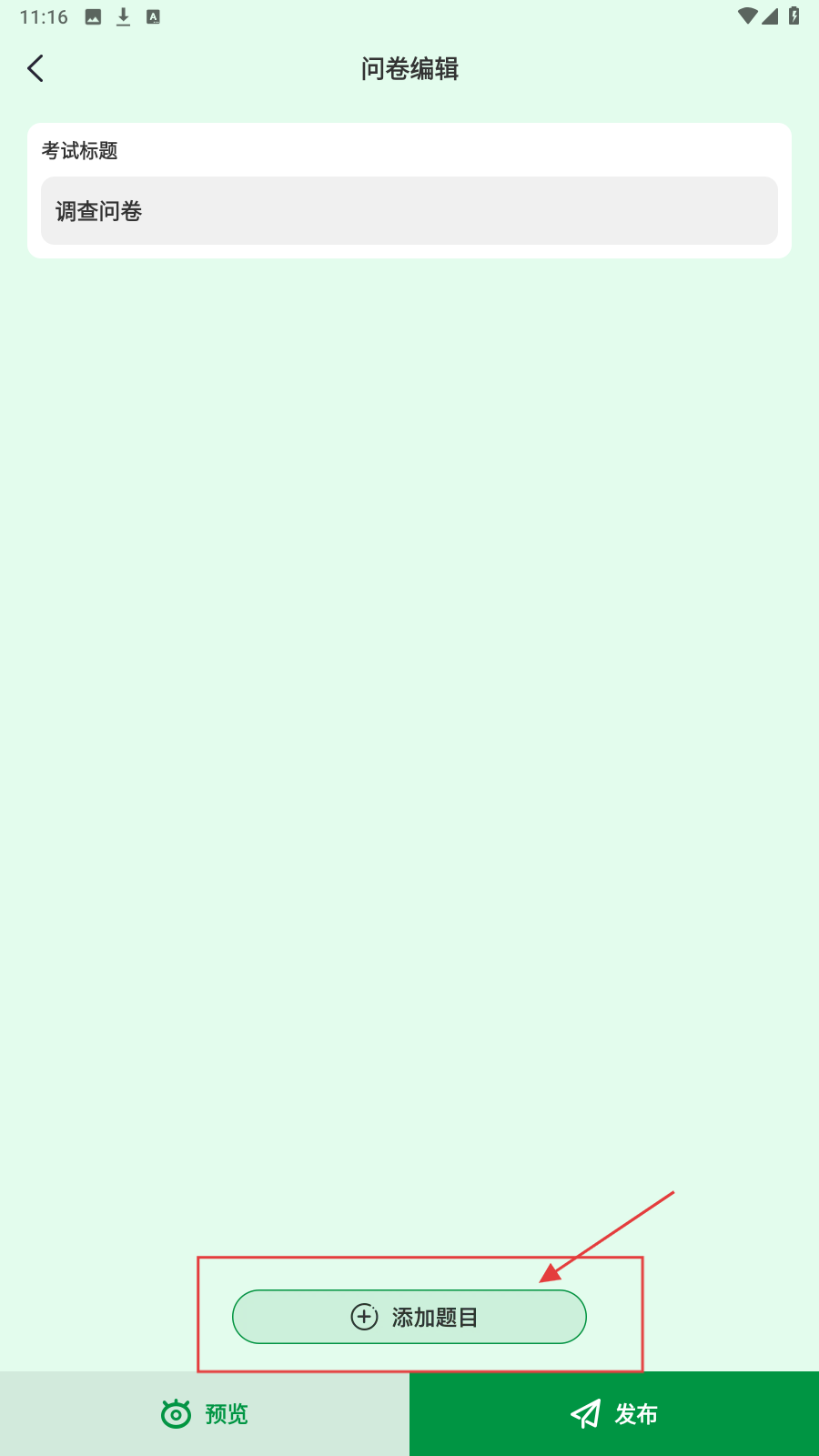 2、在【问卷编辑】页面,点击下方【添加题目】按钮。