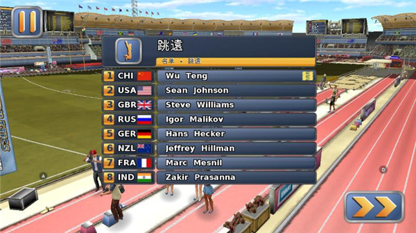 2、进入比赛之后,可以看到需要参赛的名单,来自各个不同的国家,接下来小编以跳远为例为各位小伙伴介绍一下游戏的玩法。